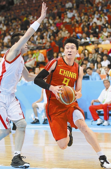 China’s Sun Yue drives the ball past a North Korean player during their Asian Games basketball match yesterday. China beat North Korea 98-62.