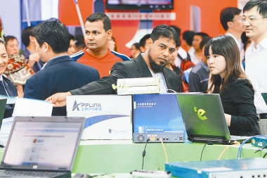 ??? A member of staff with Shenzhen MicroWorld Technologies talks to an IT engineer from the United States about computer viruses at the China Hi-Tech Fair on Thursday. Zhang Yaobo