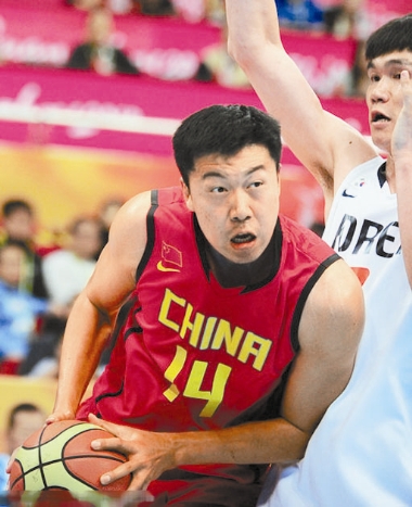 China’s Wang Zhizhi drives the ball past a South Korean player during their basketball group match at the Asian Games in Guangzhou last night. China beat South Korea 76-66.SD-Agencies