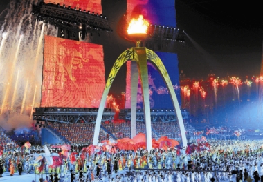 A general view of the closing ceremony of the Asian Games on Haixinsha Island in Guangzhou on Saturday night. (Inset) South Korean pop singer Rain performs with children during the closing ceremony. South Korea’s Incheon will host the next Asian Games.Xinhua |