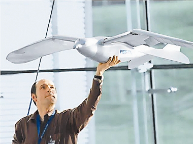 ????You could be forgiven for thinking the robot bird is real, especially when seen from a distance. ????This energy-efficient robot, weighing just 500 grams, captures the elegance* of a bird in flight. ????The robot, named SmartBird, has just been unveiled by Festo, the robotics company known for its bionic animal designs. ????It has previously created penguins* that can communicate with each other to avoid collisions* and a robotic elephant’s trunk* designed to grip objects and safely interact with humans. ????SmartBird is modeled on the herring gull and can take off, fly and land while its flight is controlled remotely from the ground in real time. ????To take off, the robotic bird flaps its wings with the help of an onboard motor. As the wings beat, the front edge also twists, enabling airflow along the wings to generate thrust*. ????Once in flight, the tail acts as a rudder* to steer the bird through the air. ????The technology could be used to design “stroke wing generators” — devices that produce energy from water. (SD-Agencies) |