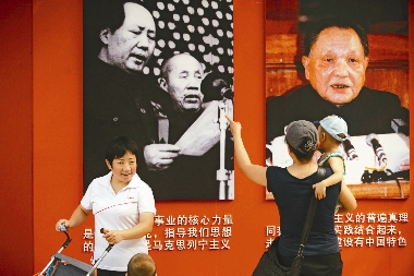 ??? A mother (C) shows her child pictures of former Communist Party leaders Mao Zedong (top L) and Deng Xiaoping (R) in Ditan Park in Beijing on Tuesday. SD-Agencies
