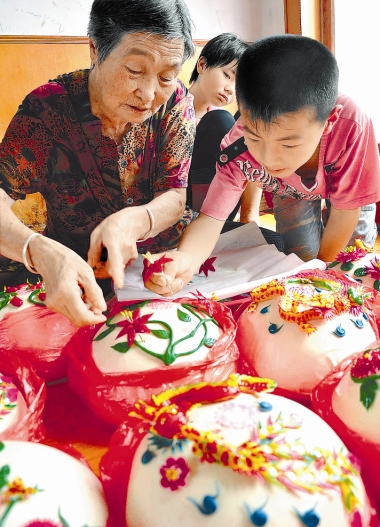 ??? An 80-year-old woman, Ji, teaches children to make “Xibobo,” a 500-year-old flour handicraft in Dingge Village in Jimo City. Locals used flour, egg and honey to make a huge steamed bun in a peach shape, which weighs between 1 and 3 kilograms, to celebrate holidays.Xing Zhifeng |
