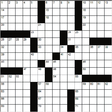 Across 1. Small drum 6. Not this 10. To tax or access 14. Identical 15. Part in a play 16. By mouth 17. Oddity 18. Eternity 19. Central area of a church 20. Severe 22. Stair 23. Too 24. Sell abroad 26. Cleave 30. A Hebrew letter 31. Type of whiskey 32. Type of sword 33. Skin disease 35. Anagram of “space” 39. Cavort 41. Clayware 43. In base 8 44. Transport commercially 46. Urine component 47. Tear 49. Lyric poem 50. Absorbs 51. Handgun 54. Arid 56. Anagram of “dome” 57. Beautiful 63. Alley 64. Where two pieces meet 65. Twined 66. Part of a comparison 67. Wise men 68. Improve 69. Classify 70. Beers 71. Cantankerous Down 1. Engineering school 2. Shade of blue 3. Prickle 4. Placed 5. Hello or goodbye 6. Conducts business 7. Square dance 8. ___ vera 9. Given to sympathy 10. An overall summary 11. Muse of love poetry 12. Hoarder 13. Napped 21. Communion table 25. A covered garden walk 26. Start over 27. Sweeping story 28. Where a bird lives 29. Division 34. Skin layer 36. Relating to aircraft 37. Kind of school 38. Nestling hawk 40. Hodgepodge 42. A drama set to music 45. Captive 48. A fourth state of matter 51. Animal hides 52. Potato state 53. Submarine detector 55. Panache 58. Blue-green 59. Docile 60. Frosts 61. Blow off steam 62. Countercurrent |