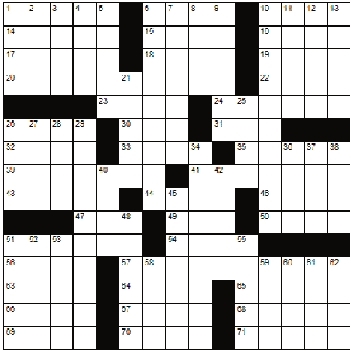 Across 1. Bursts of strong wind 6. Copied 10. Sun 14. Open, as a bottle 15. Grizzly 16. Cab 17. Crown 18. Backside 19. Nile bird 20. Fortify 22. Search 23. Nurse shark 24. Settlement 26. Sitcom set in Korea 30. Hit on the head 31. Center 32. Pearly-shelled mussel 33. Enumerate 35. Also called Peter 39. Anagram of “Ladders” 41. Indignation 43. Mournful poem 44. Peddle 46. Tall woody plant 47. Before, poetically 49. Record 50. Pay attention to 51. An unquestionable truth 54. Chocolate cookie 56. Reflected sound 57. Randomize 63. An upright in a wall 64. Modify 65. Sulk 66. A tart spicy quality 67. Blackthorn 68. Cake frosting 69. If not 70. Care for 71. Half of six Down 1. Fortitude 2. Module 3. Stigma 4. Container weight 5. Directly (archaic) 6. Slaughterhouses 7. Maybe 8. Alleviate 9. Douse 10. Spontaneous abortion 11. Forbidden 12. A low-mass chargeless particle 13. Hazardous 21. Actor Clark 25. Dethrone 26. Cogitate 27. Rectal 28. On the left or right 29. Miscellany 34. Endured 36. Filly’s mother 37. Curved molding 38. Require 40. Stringed instrument 42. Canker sore 45. Ablation 48. Not the youngest 51. “Beautiful” 52. In base 8 53. Avoids 55. Course around a star 58. Doing nothing 59. Coy 60. French for “Black” 61. Departed 62. Border |