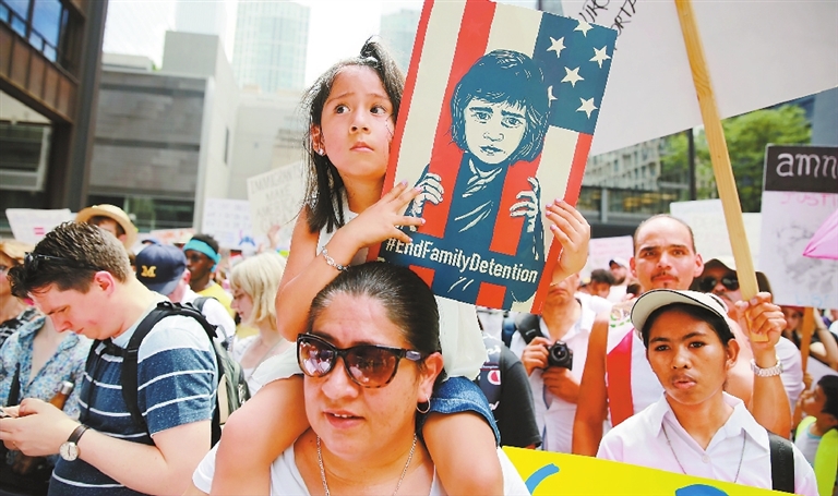 People participate in the “Families Belong Together” rally at Daley Plaza in Chicago, the United States, on Saturday. Thousands of demonstrators marched in cities across the United States on Saturday against President Donald Trump’s hardline* immigration policy and to demand the immediate* reunification* of families separated at the border with Mexico.SD-Agencies