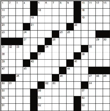 Across 1. Baseball great, ____ Ruth 5. Straddles 10. Fraud 14. Anagram of “dome” 15. Cover girl 16. Meal in a shell 17. Able to walk about 19. Hairdo 20. Anagram of “bid” 21. Killer whales 22. The color of grass 23. Fashionable 25. Throw out 27. Mineral rock 28. Skin of a drum 31. Feel 34. Dirties 35. Ribonucleic acid 36. Midmonth date 37. Englishman 38. Quarries 39. Morning moisture 40. Type of retinal cells 41. Tether 42. Cover 44. Prompt 45. Cleansing agents 46. Violent disorder 50. Prevent legally 52. Accustom 54. Petrol 55. East Indian tree 56. Prodigious 58. Departed 59. Toys with tails 60. Sea eagle 61. Countercurrent 62. Donkeys 63. Flying mammals Down 1. Tiny balls strung together 2. Acknowledge 3. Policeman (British slang) 4. Large flightless bird 5. Scant 6. Throw 7. Dwarf buffalo 8. Greenhouses 9. Secret agent 10. Polysaccharide 11. Self-serve restaurant 12. Unit of land 13. Natural satellite18. France’s longest river 22. Precious stones 24. Not a win 26. Comes after June 28. Vaulted 29. Picnic insects 30. Elan 31. On the left or right 32. Biblical garden 33. Magazine vendor 34. Inflammation of the sinuses 37. Coil 38. Chick’s sound 40. Poop 41. Unit of luminous flux 43. Truancy 44. Gentle stroke 46. Indian monetary unit 47. Ancient Greek marketplace 48. Thin 49. S S S S 50. Border 51. Not barefoot 53. Cashews and almonds 56. Calypso offshoot 57. Cotillion girl |