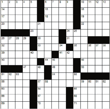 Across 1. Beckons 6. Low in pitch 10. Chess piece 14. Birdlike 15. Leave out 16. River of Spain 17. Feel 18. Adept 19. Metal money 20. Security 22. Give as an example 23. Thorny flower 24. A house with a sloping roof 26. Gave money 30. Barley bristle 31. A box for bricks or mortar 32. Unit of land 33. Satisfy 35. Appendages 39. Red wine 41. Cavort 43. Electrical pioneer 44. Agreeable 46. 53 in Roman numerals 47. Large Australian flightless bird 49. Bar bill 50. Poems 51. Distributed equally 54. Distinctive flair 56. Mugs 57. Indestructibility 63. Nursemaid 64. French for “state” 65. Papal court 66. Hubs 67. Be worthy of 68. Hard wood 69. Kind of school 70. Outbuilding 71. Leases Down 1. Stinging insect 2. Affirm 3. Italian for “wine” 4. Where the sun rises 5. Contemptuous look 6. A petty officer 7. Surrounding 8. Storage cylinder 9. Unpleasant odor 10. Indiscretion 11. Agitated 12. Produce a literary work 13. A nine-piece musical group 21. Seashore 25. Sacred 26. Agreement 27. Dull pain 28. Colored part of an eye 29. Car franchise 34. Intensified 36. A female domestic 37. French cheese 38. Slaloms 40. What a person is called 42. Souvlaki 45. Go over again 48. Mammary glands of bovids 51. Top of the head 52. The quality of being funny 53. Quickly 55. More pleasant 58. Salt Lake state 59. Lubricate 60. Press 61. Hue 62. Cheers |