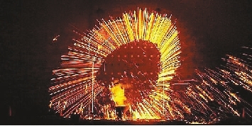 Dashuhua is a traditional Chinese performing art that takes place during certain festivals. Using special scoops made from willow roots, the performers, who are dressed in sheepskin coats and bamboo hats, throw molten iron burning at around 1,600 degrees Celsius at the city walls. The molten iron then explodes into sparks that look like glittering branches of trees.