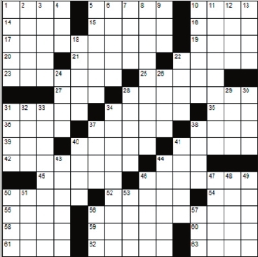 Across 1. Welt 5. Washbowl 10. Anagram of “star” 14. Nile bird 15. Full 16. Debauchee 17. Flip 19. Bit of dust 20. Tavern 21. Pale with fright 22. Style of jacket 23. Fables 25. Leave out 27. Eastern standard time 28. Sequesters 31. Ancient Greek unit of length 34. Test, as ore 35. Make lace 36. Mentally irregular (slang) 37. Lacking leadership 38. Plateau 39. Arrive (abbr.) 40. The vistas above us 41. Piquant 42. Difficulties 44. By means of 45. African antelope 46. Choral composition 50. Fastener 52. An object 54. Coniferous tree 55. Medium-sized tubular pasta 56. Nutritious 58. Desiccated 59. Construct 60. Therefore 61. Dash 62. An analytic literary composition 63. Encounter Down 1. Tufts 2. Almost 3. Oblivion 4. East southeast 5. Breed of hound 6. Housemaids 7. Disgorge 8. Sicknesses 9. Mesh 10. Fleet 11. Private compartments 12. Ballet attire 13. Views 18. Lift 22. Cunning 24. Start over 26. Weight to be borne 28. Small islands 29. Where the sun rises 30. Remain 31. Smack 32. Unit of pressure 33. Like tumblers 34. Cartoon illustrators 37. Hawaiian strings 38. Food from animals 40. Faux pas 41. High-pitched buzzing sounds 43. Next to 44. Conceit 46. Approximately 47. All excited 48. Slight color 49. Lingo 50. Mogul 51. Former Italian currency 53. Colors 56. Born as 57. Skirt’s edge |
