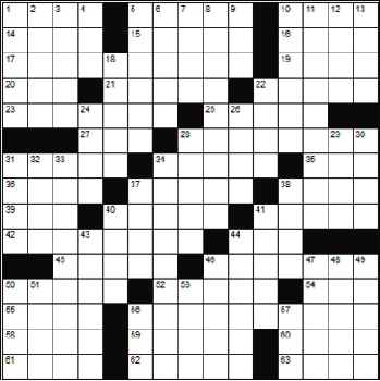 Across 1. Parts of aprons 5. Conflict 10. Carve in stone 14. 1 1 1 1 15. Urgency 16. “Iliad” city 17. A coming into being 19. Stringed instrument 20. A large vase 21. Academy award 22. Malicious 23. Avoiding detection 25. Electronic letters 27. G 28. Pieces of cloth 31. Secret agents 34. Ecru 35. Before, poetically 36. Sickens 37. Sword 38. Piece of glass 39. Favor 40. Ooze 41. Handed over 42. Overeating 44. Brassiere 45. Throng 46. Dampen 50. A stomach exercise 52. Apartments (British) 54. East southeast 55. Bright thought 56. Dentifrice 58. Secluded valley 59. Winged 60. Lummox 61. Where a bird lives 62. Mammary gland of bovids 63. Faucets Down 1. Phony 2. Unreactive 3. Sesame seed 4. South southeast 5. Virginal 6. Lock 7. Largest continent 8. Throughout the shop 9. Female chicken 10. Cultural 11. The beginning of a trail 12. Unit of cut wood 13. Hoopla 18. Parts portrayed 22. Satisfy 24. Anagram of “sage” 26. A magician 28. Squalid 29. Sea eagle 30. Sow 31. Booty 32. Bucket 33. Conscripts 34. Cloth to cover eyes 37. Hard punch 38. Legumes 40. “Cut that out!” 41. Crunchy 43. Absentee 44. Annoy 46. Not glossy 47. Electrical pioneer 48. Prevent legally 49. Requires 50. Anagram of “sing” 51. Doing nothing 53. Weight to be borne 56. Letter after sigma 57. Play a role |