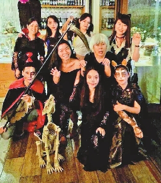 People dressed for a Halloween party pose for a picture at Mission Hills Shenzhen in Longhua District. The resort is throwing specially-tailored Halloween parties until Oct. 30.SD-Agencies