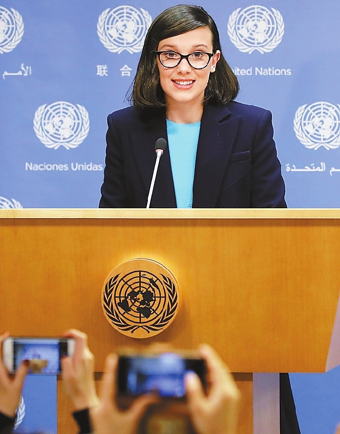 The United Nations children’s agency UNICEF appointed Millie Bobby Brown, the star of hit Net-flix series “Stranger Things,” as its youngest-ever goodwill ambassador last week, and the 14-year-old had a message for world leaders: “Listen to us.” “I want to raise issues about education and violence and ending bullying and ... making sure children have a safe environment and clean water,” Brown told Reuters at the United Nations. “But I’m still learning what I feel passionate about.” Emmy-nominated Brown, who plays Eleven, a girl with special powers who tries to help rescue a missing boy in “Stranger Things,” has spoken out in the past against bullying and last year deleted her Twitter account after a slew of hate-filled comments. Her appointment as a UNICEF goodwill ambassador marked World Children’s Day and comes after Brown co-hosted UNICEF’s 70th anniversary celebrations in New York in 2016, interviewing David Beckham on stage. UNICEF said in her new role she will help raise awareness of children’s rights and other youth-related issues including access to education and the impact of violence, bullying and poverty. “Children are their own best advocates. I know that Millie will use her passion and dedication to defend the rights of vulnerable children and young people everywhere,” said UNICEF’s executive director Henrietta Fore in a statement. When asked if she had a message for world leaders, Brown told Reuters: “Listen to us. Youth is very powerful.” She pledged to speak out for millions of children and young people whose voices had been silenced, shine a light on issues that vulnerable children suffer around the world and make sure children know their rights and empower them. Brown said she would use her platform, which includes more than 18 million followers on Instagram. She was also the youngest person to make Time magazine’s list of the world’s 100 most influential figures. “In becoming a UNICEF goodwill ambassador, I share the title with a hero of mine — the late, great Audrey Hepburn, who once said: ‘As you grow older you will discover that you have two hands, one for helping others and one for helping yourself,’” Brown told a news conference announcing her appointment. “That’s exactly what I intend to do,” she said. Brown joins a list of UNICEF goodwill ambassadors that includes former England soccer captain David Beckham, actors Orlando Bloom, Jackie Chan, and Liam Neeson, singers Ricky Martin and Shakira and YouTube star Lilly Singh. “Stranger Things” was a sensation when it kicked off its eight-episode first series on July 15, 2016. The nine-episode season two was released on October 27, 2017. But fans are going to have to wait for season three. It isn’t due until next year and Netflix has yet to set a debut date. However, Brown can next be seen on the big screen in “Godzilla: King of the Monsters” alongside Vera Farmiga, 45, and Brits Sally Hawkins, 42, and Charles Dance, 72, due out on May 31, 2019. She’s also signed up to reprise her role for “Godzilla vs. Kong” opposite Alexander Skarsgard, set for release on May 22, 2020. (SD-Agencies) |