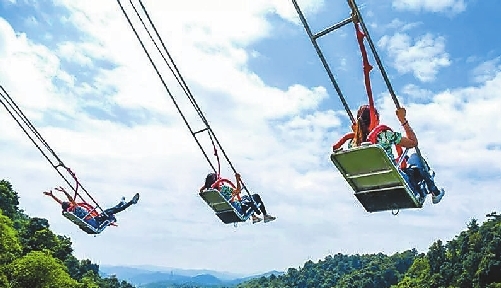 A VIDEO about a cliff swing in Chongqing went viral recently on Douyin, a social media app for creating and sharing videos as well as live broadcasting. For those who have always planned to try the cliff swing but still haven’t had time to travel all the way to Chongqing, here comes some good news. The first suspended glass skywalk project, nicknamed “Tianzi Flying Dragon,” opened in Qingyuan, Guangdong, on Nov. 2. Additionally, various challenging projects, including a cliff swing with a view of a waterfall, also await. The “Tianzi Flying Dragon” is a new project at the Tianzi Mountain Scenic Area. It’s built on top of Juebi Peak above Tianhou Waterfall and boasts an altitude of 399 meters. The skywalk is 1.8 meters wide and 399 meters long. It utilizes three layers of durable and ultra clear glass, making the walk super safe while guaranteeing a thrilling view. While walking down the corridor, flanked by the lush forest on both sides, your heartbeat can’t help but accelerate. Upon exiting the dragon body, you will find yourself on the largest glass cliff observation deck in Guangdong with a view of a waterfall and old-growth forest. Sometimes the observation deck, which covers 600 square meters, serves as a romantic site where courtship is highly successful. Asia’s No. 1 waterfall swing If you like the feeling of flying and want to scream out in the sky, you should definitely try out the cliff waterfall swing. When you sit on the swing, the electromagnetic control will pull you up into the air and then swing you out from the cliff at a 170-degree angle. Forest Rainbow Slide If you want to go downhill in the fastest way, use the Forest Rainbow Slide to slide down the hill. There are three slides in total, and two of them feature a mountain view. There are eight acceleration curves and it takes only nine minutes to reach the foot of the mountain. You may feel scared and back off when you hear the screaming in the forest. But, it’s totally worth a try. Tianhou Waterfall The Tianhou Waterfall is already quite well-known. The spectacular fall drops 128 meters. The clear water flows like a soft white ribbon against the green background of the lush forest. Walk through the valley and stand beside the handrail in front of the waterfall and you will feel the freshness of the mountain and smell the fragrance of the trees. Bamboo sea Tianzi Mountain is home to a lush bamboo sea. Walk into the bamboo forest and you will feel like you’re entering a scene from the movie “Crouching Tiger, Hidden Dragon.” Surrounded by the green bamboo, the gurgling brook and fresh air, you will feel relaxed and tranquil. Seven-Color Garden This garden features different varieties of blooming flowers. With a lake view, flower sea, green mountain and other delights of nature, you will feel like you walk into a wonderland. Guesthouse in the forest After spending a full day experiencing all of these fun things, you can stay at the guesthouse on the mountain. The two guesthouses, namely Xingkong Guesthouse and Yueguang Baohe Guesthouse, are both good choices. Add: Feilaixia Town, Qingcheng District, Qingyuan (清遠市清城區飛來峽鎮天子山風景區) (Chen Xiaochun) |