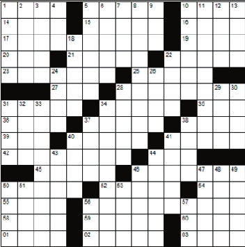 Across 1. Climax 5. Bitten 10. Join 14. Outcropping 15. Half of six 16. Shade of blue 17. Money paid for a service 19. Carpets 20. Eastern newt 21. Submarine 22. Garbage 23. Take aback 25. Artist’s workstand 27. Consumed food 28. Make more city-like 31. Manicurist’s board 34. Weeper 35. ___-zag 36. Docile 37. Good person 38. Gambling game 39. Former boxing champ 40. Held on tightly 41. Masses of floating ice 42. Chickadee 44. Ottoman governor 45. Latin name for our planet 46. Capable of being molded 50. Rise 52. Author Mark _____ 54. Actress Lupino 55. Clue 56. A distinctive characteristic 58. Ancient Peruvian 59. Overgrown with ivy 60. Conspiracy 61. Rind 62. Fixes 63. Abominable Snowman Down 1. Throbs 2. A small farm 3. Devilfish 4. Conceit 5. Horse barn 6. Spasm 7. Murres 8. Castrating 9. Precious stone 10. A colony of rabbits 11. A tying score 12. Totes 13. Ardor 18. Full of ruts 22. Russian emperor 24. Unusual 26. Assist in crime 28. Pee 29. Pizazz 30. Prima donna problems 31. French for “State” 32. Anagram of “Mail” 33. Amount emitted 34. Producing an effect 37. Disparage 38. Lock openers 40. Unit of cut wood 41. Keno 43. Not physical 44. Screens 46. Beeped 47. Name of a book 48. Fool 49. Desert plants 50. Transport commercially 51. Prong 53. Large open farm wagon (archaic) 56. Not brilliant 57. Operative |