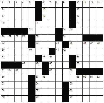 Across 1. Moves briskly 6. Bearing 10. G G G G 14. Golden 15. Being 16. Adriatic resort 17. Andean animal 18. Not a single one 19. Notion 20. Famous 22. Temporary worker 23. Palm starch 24. Waif 26. You (archaic) 30. Yes (slang) 31. Female deer 32. Anagram of “Silo” 33. Chocolate cookie 35. Foam 39. Kettledrum 41. Tiredness 43. Relieves 44. F F F F 46. Catches 47. Consumer Price Index 49. Tear 50. A feat 51. Extreme cruelty 54. Air force heroes 56. Former Italian currency 57. Paging 63. Bucolic 64. Dogfish 65. Hostel 66. Lunch or dinner 67. Take it easy 68. Gown fabric 69. Countercurrent 70. Anagram of “Seek” 71. Horse Down 1. After-bath powder 2. Govern 3. By mouth 4. An indefinite period 5. Picket line crossers 6. Zoo 7. Variant of an element 8. Feudal worker 9. Required 10. Scintillating 11. Duck down 12. Swelling under the skin 13. Frothy 21. A synthetic silklike fabric 25. Not hard 26. Carry 27. Hello 28. Shade trees 29. Particularly 34. Referees 36. Curved molding 37. Sounds of reproof 38. Command (archaic) 40. Vipers 42. Type of poplar tree 45. Easily broken 48. Skewer 51. Ooze 52. Helped 53. Wood nymph 55. Preserves 58. Berserk 59. Brag 60. Doing nothing 61. Leer at 62. Require |