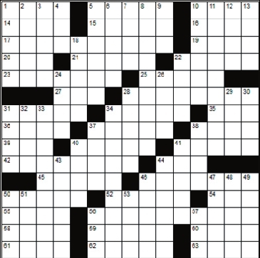Across 1. Cut away 5. Endure 10. It was (contraction) 14. Brute 15. Indicates 16. Protagonist 17. Jungle 19. Coarse file 20. Anagram of “bid” 21. Hawaiian veranda 22. Relieves 23. Trap 25. A steel wire rope 27. Rescue 28. Moved down the computer screen 31. Grill 34. Spot 35. Frozen water 36. Jazz phrase 37. Rise 38. Ancient Peruvian 39. F 40. Expect 41. “____ wilco” 42. Towards the sunset 44. Ancient unit of measure 45. Furtive looks 46. Adult male chicken 50. Rowed 52. Spook 54. Furrow maker 55. Trickle 56. Deprive 58. Eat 59. Not lower 60. Leave out 61. Wise one 62. S S S S 63. Family lines Down 1. Mob 2. Another time 3. Baby beds 4. Cognizance 5. On the train 6. Carried 7. Bright thought 8. Drying agent 9. Eastern Standard Time 10. Someone held in bondage 11. Equivocating 12. Backside 13. Absorbs 18. Thrash 22. Black, in poetry 24. Childlike 26. Very dry 28. Sedate 29. Behold, in old Rome 30. Beloved 31. Beer 32. Abundant 33. Progeny 34. Interstellar spacecraft (plural) 37. Exchange 38. Charged particles40. Blown away 41. Violent disturbances 43. A Native American tent 44. Awards 46. Indian monetary unit 47. Motif 48. A red fluorescent dye 49. Relaxes 50. Probabilities 51. Diva’s solo 53. Vipers 56. Fitting 57. Soak |