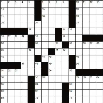Across 1. Something of value 6. Border 10. Fail to win 14. Devilfish 15. A noble gas 16. Angers 17. Spew 18. Streetcar 19. Tins 20. African holly 22. If not 23. Tale 24. Detects 26. Blacken 30. Delay 31. Cap 32. Solitary 33. Killed 35. Violent disturbances 39. Porridge 41. Pastoral poem 43. Gloomy, in poetry 44. Stigma 46. Forearm bone 47. Ribonucleic acid 49. Mineral rock 50. Appear 51. Type of fence 54. Tears 56. Dwarf buffalo 57. Dental medicine 63. Prig 64. 3 times 3 65. Female demon 66. Satan’s territory 67. Anagram of “seek” 68. Manicurist’s board 69. Backside 70. Collections 71. Dings Down 1. Ends a prayer 2. Indian dress 3. Cozy 4. Carve in stone 5. Shabby 6. Enchants 7. Perturb 8. Incite 9. Catch in a net 10. Lacking moral discipline 11. Not written exams 12. Feel 13. S S S S 21. Chip dip 25. Nobleman 26. Lummox 27. Rime 28. Pot 29. Noteworthy 34. Fatigue 36. Leer at 37. Melody 38. Where two pieces meet 40. Sea eagle 42. Crawled 45. Diadem 48. Makes amends 51. Ottoman title 52. Not outer 53. Chills 55. Anagram of “doles” 58. Water barrier 59. Disabled 60. Portent 61. Encircle 62. Cheers |