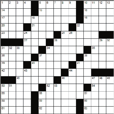 Across 1. Carve in stone 5. Mops 10. Leer at 14. You (archaic) 15. Paths 16. Gunk 17. Up to now 19. Credit or playing 20. Not on 21. Roasters 22. Arctic sled dog 23. Stammer 25. Iniquities 27. Pallid 28. Stiff hairs 31. Student 34. Gateaux 35. Genus of macaws 36. Analogous 37. Lugged 38. Hotels 39. Dowel 40. Seat 41. Walks through water 42. A star-shaped character 44. Flee 45. Regarding 46. A narrow ridge of hills 50. Felt-like fabric 52. Depart 54. Grippe 55. Unique 56. A society of women 58. Flower stalk 59. Not outer 60. Therefore 61. On the left or right 62. Equals 63. Untidyness Down 1. Community spirit 2. Larceny 3. Island in NW Greece 4. Color 5. Slob 6. Thin disk of unleavened bread 7. Again 8. Ancient Norse warrior 9. South southeast 10. Supernatural 11. Meadow 12. Lie in wait 13. Countercurrent 18. Whole 22. Snake sound 24. Identical or fraternal 26. Competed 28. Dye with wax 29. Sea eagle 30. Back talk 31. Dad 32. Hawaiian strings 33. Wearing twin plaits 34. Shore 37. Not fat 38. Poetic foot 40. Algonquian Indian 41. Bet 43. Cellular catalyst 44. Admirers 46. Despiser 47. Previously 48. Blockages 49. Praise 50. Head honcho 51. Against 53. Feudal worker 56. Take in slowly 57. Skirt’s edge |