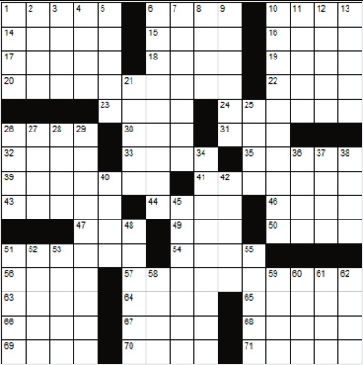 Across 1. Cassettes 6. Unit of land 10. Hearing organs 14. Panache 15. Godsend 16. Absent without leave 17. Overact 18. Cozy 19. Indian music 20. An open letter 22. Journey 23. Wings 24. Hold 26. A young male horse 30. Repair 31. Central 32. Nanny 33. Within 35. Crop up 39. Estate 41. Jungle fever 43. Trap 44. Cleave 46. Small casks 47. Santa’s helper 49. 12 in Roman numerals 50. Feudal worker 51. Antacid 54. Black, in poetry 56. Top of a house 57. Charge 63. Annoying insect 64. French for “we” 65. Wild hog of Australia 66. Leer at 67. Pigeon’s home 68. Annoyed 69. Russian emperor 70. Anagram of “seek” 71. Thorny flowers Down 1. Adolescent 2. Apex 3. Farm equipment 4. Dines 5. Grave marker 6. Nondrinker 7. Discourse 8. Debauchee 9. Memory trace 10. Dragon 11. Cognizant 12. “____ wilco” 13. Quench 21. Spritelike 25. Found on rotary phones 26. Scoundrels 27. Portent 28. Tibetan monk 29. From that time on 34. Motorcoaches 36. Angers 37. Anagram of “sing” 38. Alleviate 40. Peddle 42. “Bye” 45. Kill 48. Groom-to-be 51. Lingo 52. Yearns 53. Australian “bear” 55. Lowest point 58. Prepare food 59. Novice 60. Writing fluids 61. Curved molding 62. Gestures of assent |