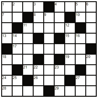 Across 1. Where crops grow 4. Not soft 7. Note after so 8. Playing card above King 10. Regarding (abbr.) 11. Rock 13. Wager 15. Large container for liquids 17. Grabbed and threw to ground 18. Vehicle 19. Immediately 21. Special snack 24. Morning 26. Extra sensory perception 27. Within 28. Fix or heal 29. Ended in a draw Down 1. Excess fat 2. Battery size 3. Small carpet 4. Female chicken 5. Rural route (abbr.) 6. Make a depression 9. Oreos and shortbread 11. Begin 12. Notable occurrence 14. Estimated time of arrival 16. Ruckus 18. Squish in 20. Magical stick 22. Color of blood 23. Suitable 25. Myself 27. That is |