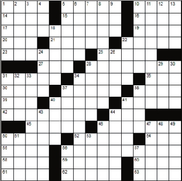 Across 1. Backside 5. A habit worn by clerics 10. Skilled 14. Prohibits 15. Soup server 16. Tall woody plant 17. Alteration 19. A dog wags one 20. Not near 21. Roasters 22. Impudent 23. Latticework 25. Long stories 27. Hankering 28. Breathing devices for swimming 31. Bongos 34. Comportments 35. Tear 36. Sharpen 37. A Eurasian aromatic herb 38. City in Peru 39. American Dental Association 40. Journeys 41. Leaky 42. Sparrow hawks 44. G 45. A sharp curve 46. Cyber-terrorists 50. Hoax 52. Characteristic 54. 7 in Roman numerals 55. Lantern 56. Blushing 58. Curved molding 59. Puke 60. Constellation bear 61. Walk in water 62. Not full 63. One who colors cloth Down 1. To the rear 2. Radiolocation 3. Type of drum 4. Clairvoyant’s gift 5. A ketone in Vitamin B2 6. Charges per unit 7. Norse god 8. Proximity 9. Cognizance 10. Assault 11. A small restaurant 12. Wreaths 13. Evasive 18. Metalwares 22. Knights 24. An acute inflammatory disease 26. Small horse 28. Settles 29. Not stiff 30. Neuter 31. East Indian tree 32. Was a passenger 33. Brazen 34. Whirlpool 37. Journey 38. Scallion 40. Stepped 41. Religious splinter groups 43. A small hairpiece 44. Merriment 46. Ritual 47. Each and all 48. Dentist’s direction 49. Indian instrument 50. Current 51. Indian music 53. Backside 56. Night before 57. Rechewed food |