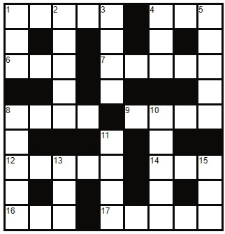 Across 1. Moisten meat with hot fat 4. ___-Tac-Toe 6. Resort 7. Very big 8. Not us 9. Scheme to trick 12. Chew with them 14. Upper limb 16. Round length of wood 17. Sleeping thoughts Down 1. Large passenger vehicle 2. Square or circle 3. Girl’s building toy 4. Sticky black substance 5. Put it in coffee 8. Sum 10. Shipping box 11. Tool house 13. Laid by a bird 15. Mother |