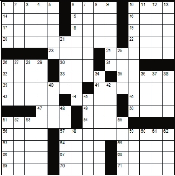 Across 1. Surpass 6. Air force heroes 10. 20th-century art movement 14. Got up 15. Lake (Scottish) 16. Nile bird 17. Steam bath 18. Ancient Peruvian 19. Drunkards 20. Typographer 22. Ballet attire 23. Tall woody plant 24. Anagram of “rioted” 26. Travel on water 30. A large vase 31. Lair 32. Annul 33. Felines 35. He plays a role 39. Refuse to do business with 41. Carrying boats overland 43. Beauty parlor 44. Biblical kingdom 46. Former Italian currency 47. Muck 49. Anagram of “ail” 50. The original matter 51. Levy 54. Liturgy 56. Encircle 57. The climax of a drama 63. 62 in Roman numerals 64. Send forth 65. 3-banded armadillo 66. Greek liqueur 67. 3 times 3 68. Risk 69. Not closed 70. Labels 71. Be Down 1. Where the sun rises 2. Roentgen ray 3. Masterstroke 4. Feudal worker 5. Not the most 6. Uneducated person 7. Carefree 8. Behold, in old Rome 9. Distributed equally 10. Clearly 11. More or less 12. Repeat 13. An ancient Assyrian city 21. Spew 25. Costly 26. U-boats 27. Dwarf buffalo 28. Bucolic 29. Movement 34. Pillages 36. A dog wags one 37. Monster 38. 500 sheets 40. Burden 42. Leaves out 45. Dashing 48. Fair 51. Snow house 52. Confusion 53. Award 55. French for “storehouse” 58. Dogfish 59. Pinnacle 60. Indian dress 61. Colored part of an eye 62. Sodium chloride |
