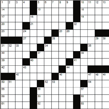 Across 1. F F F F 5. Saying 10. Mats of grass 14. Need a bath badly 15. Spoofs 16. Wicked 17. A supplementary part 19. Start over 20. Foot digit 21. Lubricated 22. Fortuneteller’s card 23. Hospital attendant 25. Attune 27. Baboon 28. Awards 31. Central points 34. Japanese wrestlers 35. Type of whiskey 36. French for “we” 37. Clan emblem 38. Existed 39. Barley bristle 40. Taxonomic group 41. Center 42. Flannels 44. Big wine holder 45. A valley (British) 46. A small house 50. Scrawny one 52. Angry 54. Tall hill 55. Equal 56. Blushing 58. Applications 59. Venomous snake 60. ___ vera 61. Feudal worker 62. Utilizers 63. Costly Down 1. Muse of love poetry 2. Stench 3. Celebrated 4. Calypso offshoot 5. For some time 6. Indistinctly 7. Away from the wind 8. French policemen 9. Eastern Standard Time 10. Angel 11. Overly fatigued 12. Prank 13. Notch 18. Marine ___ 22. Faucets 24. Dines 26. Bad end 28. Ballet skirts 29. Visual organs 30. Dispatched 31. Chew 32. Hawkeye State 33. Sunblock 34. Musical birds 37. Squad 38. A mooring post 40. Hot rum drink 41. Married partners 43. Raspy 44. They cast ballots 46. A heavy wooden pole 47. Poplar tree 48. Columbus’s birthplace 49. Go in 50. Disgorge 51. To tax or access 53. Boorish 56. French for “water” 57. Knave |