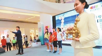 Artworks made of environmentally friendly materials by 100 children are on sale at Guanlan New City in Longhua District on August 3. A charity sale of the 300 artworks will help treat children suffering serious diseases in Longhua District. Sun Yuchen |