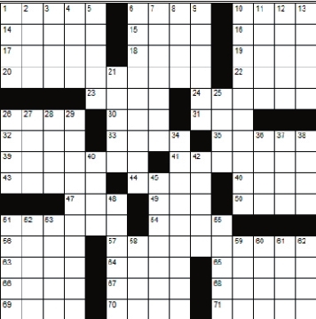 Across 1. Of lesser importance 6. Smack 10. Sexual assault 14. Wear away 15. Story 16. Auspices 17. A nine-piece musical group 18. Breezed through 19. 1/100th of a dollar 20. Unsupervised outside 22. “Do ___ others...” 23. A fish similar to cod 24. Portable computer 26. Chop finely 30. Ribonucleic acid 31. French for “summer” 32. Wings 33. Evasive 35. Not written exams 39. Fearful people 41. Annual book of information 43. Japanese stick fighting 44. Alike 46. Roman robe 47. Unruly crowd 49. Evil spirit 50. Where the sun rises 51. Highly seasoned sausage 54. Lascivious look 56. It was (contraction) 57. Lapse 63. Awestruck 64. Indian dress 65. Mooch 66. Backside 67. Black, in poetry 68. Put forth, as effort 69. Equal 70. Fecal matter of animals 71. 10-cent coins Down 1. List of options 2. Press 3. Not a single one 4. Poems 5. Barf 6. Utterness 7. Milky 8. Away from the wind 9. Sell 10. Recover 11. Spy 12. Kind of bean 13. Prevent legally 21. Rowed 25. “Smallest” particle 26. Cut away 27. Found in some lotions 28. Wood that is cut 29. Schoolmaster 34. Whining 36. Dwarf buffalo 37. Falls behind 38. Leave in a hurry 40. Space 42. Pariah 45. Control surface on a plane 48. Prejudiced 51. An elongated leather strip 52. Cognizant 53. Expire 55. Sped 58. Hindu Mr. 59. Cab 60. As just mentioned 61. Brute 62. Catches |