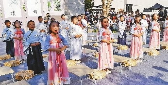 Children from Lianhua Primary School wear traditional Chinese outfits and read classical Chinese poems to celebrate the Poetry Park’s opening on Monday. The park is to the north of Civic Center in Futian District.