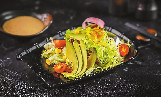 On the menu are lots of choices – though not too fancy – that represent the quality of Japanese cuisine. Fresh seasonal vegetables and avocado salad is served on black pottery plates, accompanied by sesame sauce dressing.