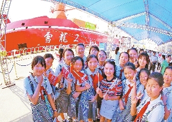 Students from Shenzhen Experimental School visit China’s first domestically built icebreaker on Sunday, Snow Dragon 2, or Xuelong 2, which set off from Shekou Cruise Homeport in Shenzhen yesterday.