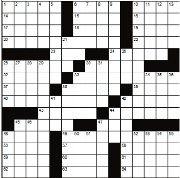 Across 1. Boxes lightly 6. An aquatic bird 10. Make well 14. Course around a star or planet 15. South American country 16. Hodgepodge 17. Birthing coach 18. 53 in Roman numerals 19. Infamous Roman emperor 20. Later 22. Portent 23. Beam 24. Harsh 26. Chalice 30. Columbus’s birthplace 32. Homeric epic 33. Covenant 37. Blend 38. A bleaching vat 39. Hawkeye state 40. Having several husbands 42. Uproar 43. Leg joints 44. Not complex 45. African antelope 47. 2,000 pounds 48. Ringlet 49. Handicap 56. By mouth 57. As just mentioned 58. Papal court 59. If not 60. Half-moon tide 61. Rap 62. One who colors cloth 63. Pinup’s legs 64. Americans Down 1. Fizzy drink 2. Academician 3. Adjoin 4. Anger 5. Featured 6. Spread out 7. Small dam 8. Dry 9. Pain in the neck 10. Money paid for a service 11. Lacquer ingredient 12. Broadcast 13. Diving bird 21. A Buddhist temple 25. Loving murmur 26. Hobbling gait 27. Margarine 28. Tab 29. Seducer 30. Gadabouts 31. Covetousness 33. Formally surrender 34. A hamlet (South African term) 35. Absent without leave 36. Container weight 38. Manipulating dough 41. Autonomic nervous system 42. Fussy 44. Weep 45. Muscular 46. Delete 47. Presses down 48. College girl 50. Bright thought 51. Where two pieces meet 52. Roman moon goddess 53. Weightlifters pump this 54. Clock sound 55. Wild Tibetan oxen |