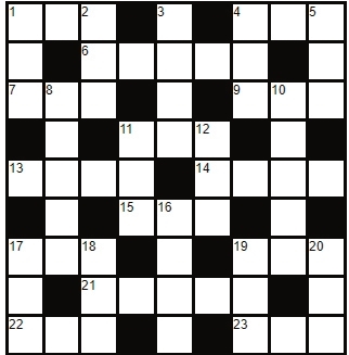 Across 1. Advertisements 4. Price for service 6. Absorbent cloth 7. Horses eat it 9. Not me, thee 11. Sight organ 13. Bridge; covering a distance 14. Not on time 15. Not bright 17. Yes, in a vote 19. Make a mistake 21. Rock 22. Past of meet 23. Allow Down 1. Residue of fire 2. Pig’s home 3. Move slowly back and forth 4. Take flight 5. Large flightless bird 8. Make request 10. A swift swimming mammal 11. Not the beginning 12. Type of tree 16. Thing to worship 17. Upper limb 18. Eastern Standard Time 19. Snake-like fish 20. Decay |