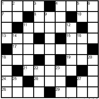 Across 1. Autumn 4. Very dry 7. Note after so 8. Eastern Standard Time 10. That is 11. Cut into cubes 13. Sheep sound 15. Belonging to us 17. Children’s book author 18. Female deer 19. Snake-like fish 21. 10-cent coins 24. Advertisement 26. Chemical in aspirin 27. Intravenous (abbrev.) 28. Not hot or cold 29. Melody Down 1. Bungle 2. Battery size 3. Flowery necklace 4. Had eaten 5. Roman 2 6. Honey, sweetheart 9. Yells 11. Challenged 12. Quantities of medicine 14. Ruckus 16. Utilize 18. Sketch 20. Strong affection 22. _ __; you are; he is 23. Consume food 25. Father 27. Within |