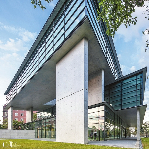 To cope with the conditions of being in a seismically active area, the architecture is supported with tilted pillars instead of vertical pillars. V-shaped steel frames used to support the architecture create triangular spaces against the glass curtain wall while the hanging parts of the steel frames create a space beneath cantilevers that becomes a shaded arcade connecting the entrance to the front plaza.  (Chen Xiaochun)