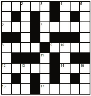 Across 1. Moisten meat with hot fat 4. ___-Tac-Toe 6. Resort 7. Very big 8. Not us 9. Scheme to trick 12. Chew with them 14. Upper limb 16. Round length of wood 17. Sleeping thoughts Down 1. Large passenger vehicle 2. Square or circle 3. Girl’s building toy 4. Sticky black substance 5. Put it in coffee 8. Sum 10. Shipping box 11. Tool house 13. Laid by a bird 15. Mother |