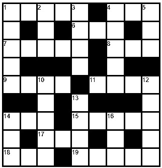 Across 1. Elude 4. Unhappy 6. Segment of a circle 7. Sanctify 8. Type of tree 9. Very uncommon 11. Make a depression 14. Constrictor snake 15. Burn brightly 17. Tell an untruth 18. Short for Thomas 19. Walk on Down 1. Glowing fragment of fire 2. Beer 3. Simple 4. Place of action 5. Not bright 10. Kingdom, domain 12. Current style or fashion 13. Encourage 14. Wager 16. Had eaten |