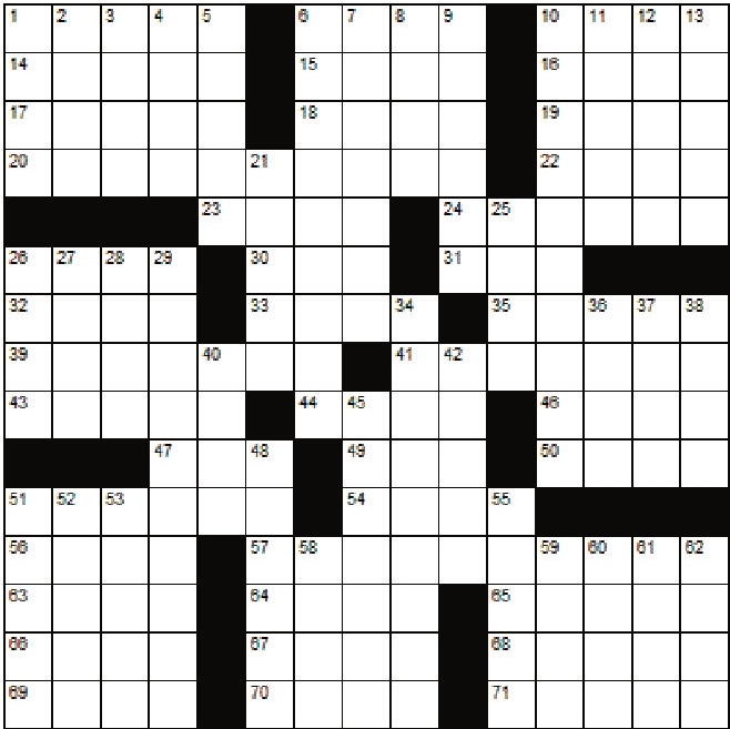 Across 1. Push 6. Gave money 10. At one time (archaic) 14. Was fond of 15. Country bumpkin 16. Make do 17. Grant 18. Norse god 19. “Wise” birds 20. Druggist 22. Tidy 23. Foment 24. Terminates 26. Arrived 30. Stir 31. Flee 32. “Smallest” particle 33. Feces 35. Anagram of “Debit” 39. Skeptic 41. Teach 43. Lance 44. Behold, in old Rome 46. Wings 47. “The Matrix” hero 49. A high alpine meadow 50. Permits 51. Missile 54. Travel on water 56. Astringent 57. Vacillation 63. Atmosphere 64. Test 65. Japanese stick fighting 66. Not odd 67. Rend 68. Prevent legally 69. In order to prevent 70. Sun 71. Shop Down 1. Smack 2. Not low 3. Gumbo 4. Swerve 5. Swelling under the skin 6. A set sequence of steps 7. Accounts inspector 8. Nile bird 9. Relating to the teeth 10. Frugal 11. Oarsman 12. Water balloon sound 13. Exams 21. Diminish 25. Hindu Mr. 26. Scoundrels 27. At the peak of 28. Pout 29. A long artificial mound 34. Anagram of “Reclaimed” 36. Glen 37. French for “State” 38. T T T T 40. Tall woody plant 42. To yield or submit 45. Manioc 48. Not these or those 51. “Bolero” composer 52. Drink garnish 53. Blocks 55. Bodies of water 58. Way out 59. Check 60. Within 61. Smell 62. No |