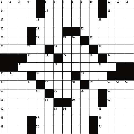 Across 1. State unequivocally 5. Deck suit 11. Come ___ head (culminate) 14. 1953 Leslie Caron classic 15. Grueling experience 16. Mo. when DST begins 17. Grace Stafford supplied his voice 20. 2001 Will Smith biopic 21. Tot up 22. Greek moon goddess 23. “You got that right!” 24. Mike who plays Austin Powers 27. Acclaim 28. Fulton’s energy source 30. Word before freeze or fry 32. Event arranged by Don King 33. “Caroline in the City” star Thompson 35. Like a circus high wire 37. Lbs. and mgs., e.g. 38. Nancy Cartwright supplies his voice 41. “___ Lazy River” 43. Mouth-puckering 44. Heavenly body in the “Today Show” logo 45. Standard 47. Nest noise 49. Towards the top of the atlas 53. Car seat attachment 55. Continental competitor 57. Have a balance 58. Some cop show scenes 60. Escort’s offering 61. Maude portrayer Arthur 62. June Foray supplies his voice 66. Benevolent order member 67. Bowlers’ group 68. Flow slowly 69. Fright film auteur Craven 70. Dealt with maliciously 71. Turned blue, perhaps Down 1. Without exception 2. One end of the spectrum 3. Kay Thompson brat 4. Relieve (of) 5. Dude ranch greeting 6. Wore away 7. “Much ___ About Nothing” 8. Traffic-stopping hue 9. 38-Down “lullaby” 10. Leopard-like 11. Wrestling move that drops an opponent 12. Flare, as nostrils 13. Takes in for booking 18. Complains 19. Shillelagh or cudgel 25. One who’s glad to be out of work, perhaps 26. Clothing closure 29. In the manner of, on a menu 31. Suckling seals 34. Perched on 36. It’s often wrongly called a “tidal wave” 38. “Gomer Pyle” setting 39. Sought damages from 40. Inspiration for Lennon’s “Woman” 41. Remove a bottle cap 42. It can make a Buick bounce 46. Superhero’s secret identity preserver 48. Honor suitable for hanging 50. Manhattan with Scotch 51. Pluck eyebrow hairs 52. Made sound again 54. Does a K.P. chore 56. Brought into alignment 59. Recipe segment 63. ___ Alai 64. Pepper or Snorkel (abbr.) 65. Shower curtain suspender |