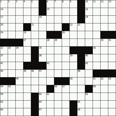 Across 1. Browning’s Ben Ezra, e.g. 6. Epps, the actor 10. Sgt. Preston’s grp. 14. With force 15. “Aida” backdrop 16. Author Wiesel 17. Book protection 19. Parent’s warning 20. Invite 21. Peter Fonda role of ‘97 22. Debate subjects 24. Hilton Head Island, for one 26. Put to the test 27. Be in control 32. Church part 35. ___ avis 36. Fury 37. Parts of mins. 38. Some are blind 40. “There’s ___ day dawning ...” 41. Debate side 42. Rash reaction? 43. Famed fed 44. Pompous person 49. Stadium levels 50. Deceived 54. Secret information 56. Dark, poetically 58. Bullring “Bravo!” 59. Printer’s blue-green 60. Metier 63. Cleopatra’s love Antony 64. Beanery offering 65. Become allied 66. In ___ (existing) 67. Metal-stamping tools 68. Conundrum Down 1. Detecting device 2. Tickle one’s funny bone 3. Soaks up sun 4. Byte fraction 5. Wound 6. “For ___ in My Life” (Stevie Wonder) 7. Nichols or Wallace 8. Pub staple 9. Go on a pension 10. View from Jidda 11. Seventh heaven 12. Selfish one’s exclamation 13. They may be collared 18. They have crosses to bear 23. Take tea 25. Hasn’t ponied up 26. Island roof material 28. Fast waters 29. Harness races 30. Spanish crowd? 31. Keeps folks in stitches 32. Egyptian cobras 33. Feeling one’s oats 34. Army reconnaissance transports 39. Israel’s Peres 40. Garden soldiers 45. Ring bearer? 46. Swampland 47. Videotaped over 48. Register a sale? 51. Heavyweight champ from 1937-4952. Ins 53. A way to discourage 54. Vertex 55. Certain thick-piled rugs 56. Noted Harper’s Bazaar illustrator 57. Nickname for Springsteen 61. Mai ___ cocktail 62. ___-cone (summer treat) |