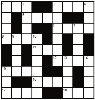 Across 1. Heavy mist 3. Past of pay 5. Partly open 6. Unsure 8. Meat spread 11. Second (abbr.) 12. Makes mistakes 15. One sheet of paper 16. Reflected sound 17. Normal (abbr.) 18. Not a woman Down 1. Flutter 2. Manner of walking 3. Queen’s son 4. Not night 7. Equitable 9. Region 10. Having high opinion of 13. A divided space in a house 14. In the near future 15. Shallow cooking vessel |