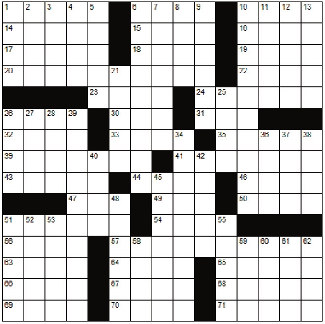 Across 1. Reprimand 6. Chime 10. Ammunition 14. Creepy 15. District 16. Smear 17. Swelling under the skin 18. Fly high 19. An amount of medicine 20. As deserved 22. Colored part of an eye 23. Harvard rival 24. Become aware 26. Ride the waves 30. Martini ingredient 31. 12 in Roman numerals 32. Hodgepodge 33. “Do ___ others...” 35. Yearns 39. Asylum seeker 41. Disentangle 43. Spare 44. Satisfy 46. Dogfish 47. Consumer Price Index 49. Actress Lupino 50. Gave temporarily 51. Arctic moss 54. Lie in wait 56. Unit of land 57. A seductive photograph 63. Violent disturbance 64. Nobleman 65. Promised 66. Sleeveless garment 67. Blackthorn 68. Make improvements 69. Backside 70. Care for 71. Lariat Down 1. Sow 2. Formally surrender 3. Mining finds 4. Citrus fruit 5. A special loved one 6. Standards 7. Causing erosion 8. Loyal (archaic) 9. Voice box 10. Extra 11. New Zealand native 12. Melodies 13. Overweight 21. Hard to pin down 25. Anagram of “Silo” 26. Achy 27. Gorse 28. Break in friendly relations 29. A fork 34. Defeated in competition 36. What a person is called 37. Smile 38. Thin strip 40. Stare 42. Approaches 45. Control surface on a plane 48. Unlawful intercourse 51. Stage between egg and pupa 52. Less friendly 53. Pass over 55. A sturdy belaying pin 58. Fit 59. Unwakable state 60. Amazes 61. Knows 62. Cocoyam |