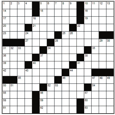 Across 1. Sandwich shop 5. Drying cloth 10. Whip 14. Burden 15. Adhesive 16. On the road 17. Imperishability 19. School session 20. An uncle 21. African language 22. Varnish ingredient 23. Makes unhappy 25. Not the most 27. Altitude (abbr.) 28. Ghosts (British spelling) 31. Mosey 34. Follow stealthily 35. Website address 36. Pierce 37. Not clergy 38. Skin disease 39. Estimated time of arrival 40. Pedal 41. Out of kilter 42. “Unchoose” 44. Biblical boat 45. Make a splashing sound 46. A stiff hair 50. Chin indentation 52. 3-banded armadillo 54. Barbarian 55. A titled peer of the realm 56. Blushing 58. Hodgepodge 59. Loves 60. Desire 61. Anagram of “Lyme” 62. Genuflected 63. Equal Down 1. Numbskulls 2. Colonic 3. Enticed 4. Belief 5. Renter 6. Unlocks 7. Habit 8. Exonerate 9. Alkaline liquid 10. Most recent 11. A feeling of wonder 12. Indian dress 13. Song of praise 18. Poplar tree 22. Torture device 24. Broad valley 26. Evasive 28. Supporting column 29. Sea eagle 30. Killed 31. Ripe 32. Bit of dust 33. A small restaurant 34. Sweetener 37. Caustics 38. Demands 40. Coagulate 41. Operatic solos 43. Kingdom of the elves 44. Halt 46. Biblical tower 47. Not here 48. Move forward suddenly 49. Go in 50. Cause surfeit through excess 51. Take it easy 53. Throw up 56. Antlered animal 57. Mug |