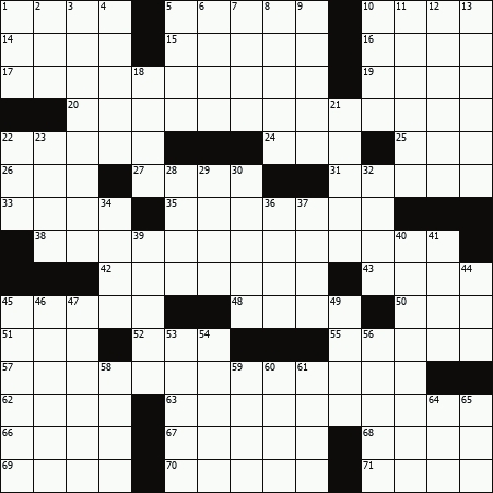 Across 1. Strike-breaker 5. A Marx brother 10. Silent film vamp Theda 14. Tuscan river 15. “My Cherie —” (Stevie Wonder song) 16. Lively old dance 17. Accommodate 19. Sea eagle 20. Folding entryway 22. Cube root of 27 24. Virginia college 25. Took the bait 26. Tennis shot 27. Fax button 31. Some leather workers 33. Like Arthur Fonzarelli 35. Place to berth a ship 38. Certain halftime performer 42. Snoop’s vantage 43. Wee bit 45. Slangy farewell 48. Circus horn-player 50. Whelp 51. Kind of tray 52. “At Seventeen” singer Janis 55. Jockey Arcaro 57. Company informer 62. Fairway alert 63. Without rational basis 66. Constellation bear 67. Condensed, memorable saying 68. Russian ruler 69. Nullified tennis serves 70. Slalom’s makeup 71. Memo words Down 1.Cul-de-___ 2. ___-Magnon man 3. Michigan city 4. Italian bowling game 5. Symbol of goodness 6. Arabian V.I.P. 7. “The Long and Winding —” 8. Russian president 9. Two-tone snacks 10. Born’s partner 11.Bacteria requiring oxygen 12. “The Bathers” painter Pierre 13. Advisories 18. Finishes the cake 21. Push gently 22. Letters of devotion 23. Car part 28. TV award 29. Flood avoider 30. Martial arts schools 32. Legendary Himalayan creature 34. Gospel writer 36. Actor’s quest 37. Type of rug 39. Be worthy of 40. Scatter fertilizer over a lawn 41. Lady’s small handbag 44. Simian 45. Legitimate 46. On liberty 47. Parched feeling 49. Less than decent 53. Primitive aquatic organisms 54. School clique, maybe 56. Triangle of land in a river 58. Red and Dead 59. Constricting snakes 60. Winter Olympics vehicle 61. Some bills 64. Remained unused 65. Broadway letters describing a hit show |