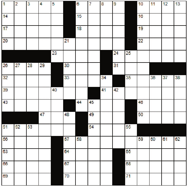 Across 1. Adhesive 6. It forms on a wound 10. Shade trees 14. Proprietor 15. Story 16. Inner membrane of embryos 17. Muse of love poetry 18. Dwarf buffalo 19. A single time 20. Typographer 22. Body of water 23. Type of sword 24. Self-centered person 26. Anagram of “Prod” 30. Fury 31. 18-wheeler 32. Murres 33. Ice cream holder 35. Fine thread 39. A member of the Cosa Nostra 41. A loud kiss 43. Mix 44. Flexible mineral 46. Car 47. Directed 49. Henpeck 50. Young girl 51. Unorthodox tenets 54. Expectoration 56. Historical periods 57. Pronounced 63. Not legs 64. Amazes 65. Hearing-related 66. Agitate 67. Food from animals 68. Earthenware jar 69. 3 70. Probabilities 71. Peddles Down 1. He writes in verse 2. Askew 3. Break 4. French for “Head” 5. Jagged 6. A guest cabin 7. A flask for carrying water 8. Balm ingredient 9. Holder 10. Interdependence of living organisms 11. Hawaiian veranda 12. Mires 13. Mixture of rain and snow 21. Long stories 25. Arizona river 26. Lacking intellectual acuity 27. By mouth 28. Abundant 29. In a non-hurting manner 34. Dreamers 36. Gull-like bird 37. Permits 38. God of love 40. Poems 42. Wizardry 45. In lieu 48. Generator 51. It pumps blood 52. Mistake 53. Bog hemp 55. Instruct 58. Was indebted 59. Emanation 60. Found over each eye 61. Deficiency 62. Large North merican deer (plural) |