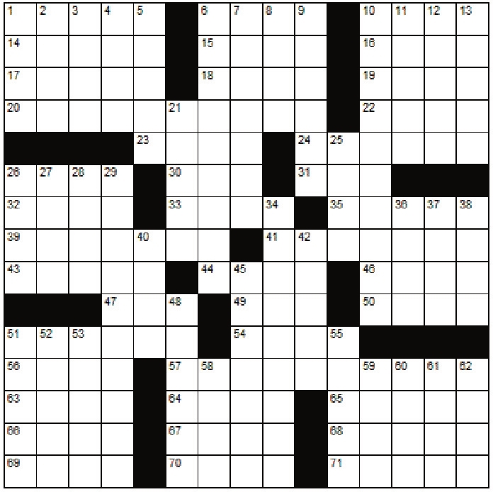 Across 1. Prisons (British) 6. Breezed through 10. Envelop 14. Glorify 15. Minute opening 16. Puncture 17. Excuse 18. A basic knitting stitch 19. Probabilities 20. Remunerate 22. Scallion 23. L L L L 24. Hypothesis 26. A short strap of leather 30. Beer 31. Dawn goddess 32. Double-reed woodwind 33. After-bath powder 35. Terrace 39. Trampled 41. Everlasting 43. Submarine detector 44. Sort 46. Sea eagle 47. 19th letter of the Greek alphabet 49. Consumed food 50. Thorny flower 51. Earnest 54. Tuft 56. Analogous 57. Informed or familiar 63. Donated 64. Murres 65. Fertile areas 66. Mimics 67. Lease 68. Inuit boat 69. Knights 70. Balcony section 71. Darlings Down 1. Equipment 2. Spindle 3. Ear-related 4. Gray wolf 5. Ooze 6. Litigant 7. Advise 8. Makes a mistake 9. Erase 10. Middleman 11. Cowboy sport 12. Birch relative 13. Annoying 21. Dish 25. Expect and wish 26. Scribbles (down) 27. River of Spain 28. Any day now 29. Solemnity 34. Fascinate 36. Lawn mower brand 37. Hotels 38. Curved molding 40. Apothecary’s weight 42. Ganders 45. Gaping sleepily 48. Straighten out 51. Heroic tales 52. Relative of a giraffe 53. An organ of the body 55. Arrogant 58. Chocolate cookie 59. Alike 60. Largest continent 61. Close 62. Sounds of disapproval |