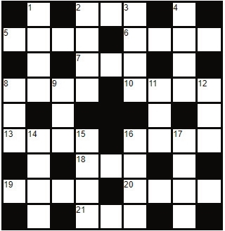 Across 2. Swampy place 5. Defendant’s statement 6. Mature fruit 7. Ocean 8. Primates 10. Mute actor 13. Pick up 16. Green or waxed veggie 18. Ukulele (abbr.) 19. Look fuzzy 20. Fibbed 21. Nothing Down 1. Flutter 2. Low sounding guitar 3. Weight measurement 4. Unwanted email 8. Everything 9. Santa’s helper 11. I have 12. Long period of time 14. Small island 15. Change direction 16. Chime 17. Said at end of prayer |
